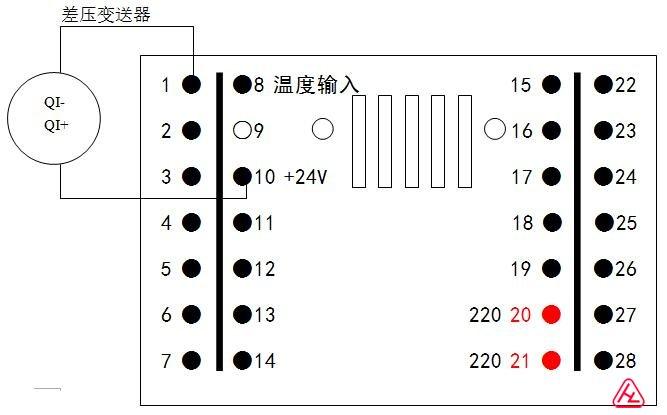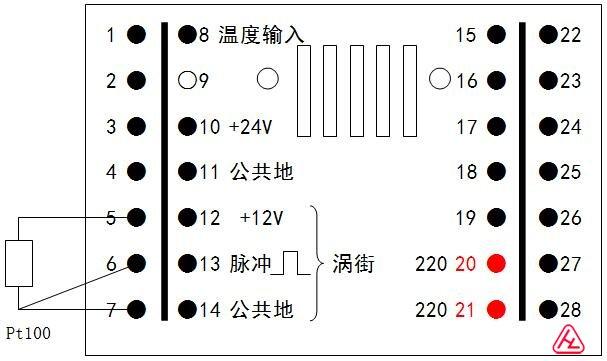 | 1.模擬流量信號輸入;2.流量再發送電流輸出;3.RS-485,A;4.RS-485,B;5.Pt100,A;6.Pt100,B;7.Pt100,B;8. 溫度電流信號輸入;9. 空;10. 24V; | 11.公共地(GND);12. 12V;13.脈沖流量信號輸入;14.公共地(GND);15.發料啟動按鈕;16.發料停止按鈕;17.清零/復位按鈕;18.按鈕公共接點;19.接大地;20.220V; |