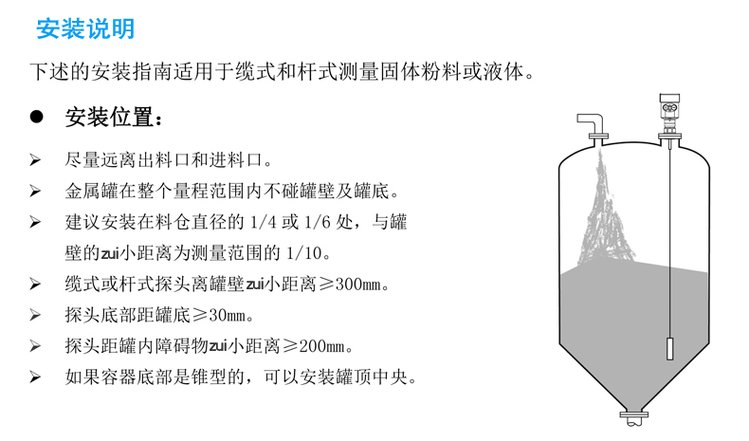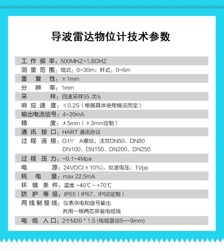 是依據時域反射原理(TDR)為基礎的雷達料位計,雷達料位計的電磁脈沖以光速沿鋼纜或探棒傳播,當遇到被測介質表面時,雷達料位計的部分脈沖被反射形成回波并沿相同路經返回到脈沖發射裝置,發射裝置與被測介質表面的距離同脈沖在其間的傳播時間成正比,經計算得出液位高度。導波雷達料位計適用于酸堿儲罐、漿料儲罐、固體顆粒、小型儲油罐。各類導電、非導電介質、腐蝕性介質。如煤倉、灰倉、油罐、酸罐等。