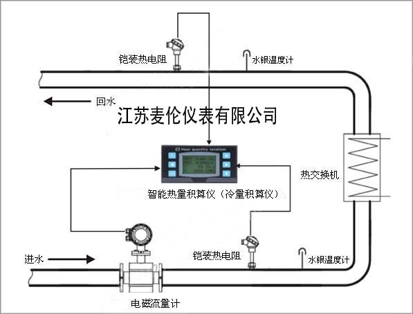 電磁流量計測量外,超聲波流量計也可用于測量。客戶可根據(jù)現(xiàn)場情況進(jìn)行選擇。超聲波流量計熱能計量系統(tǒng)安裝示意圖如下;超聲波流量計采用國際標(biāo)準(zhǔn)焓值和熱量計算公式(焓差法)測量制冷量熱量。為滿足用戶在不同工況下的需要,可分為集成式和分體式,適用于火電公司空調(diào)冷量、熱量及機(jī)組、建筑物、換熱站、管網(wǎng)的熱量計量;在熱阻的選擇上,CK儀表采用優(yōu)質(zhì)、高精度的甲級鎧裝熱阻,精度為±0.2%,大大提高了系統(tǒng)的精度。耐熱接線盒防水防潮,使用壽命長。