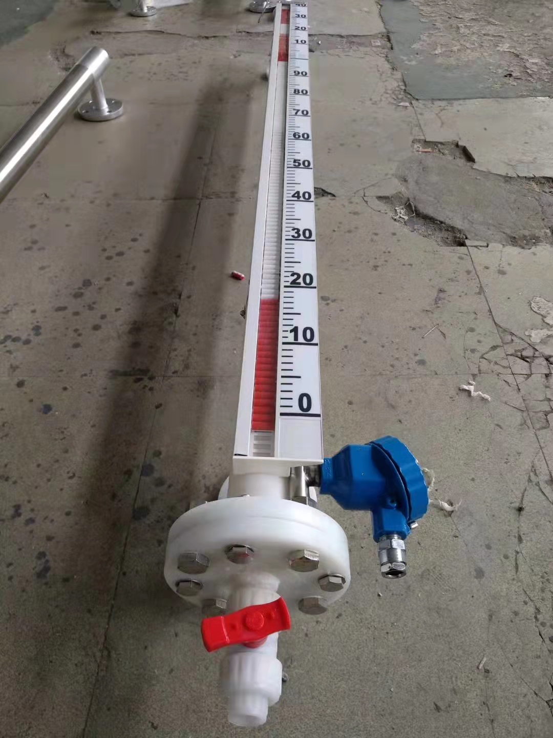 磁翻板液位計(jì)本實(shí)用新型結(jié)構(gòu)簡單,安裝維護(hù)方便;安裝液位計(jì)必須垂直安裝,以確保浮球組件能夠在主管內(nèi)自由上下移動(dòng);***在容器和液位計(jì)之間安裝一個(gè)截止閥,以清潔和維修液位計(jì)并切斷材料;液位計(jì)主管周圍不允許有導(dǎo)電磁鐵,否則將直接影響液位計(jì)的正常工作;以法蘭中心線的垂直度安裝液位計(jì)∠ 4 ‰. 當(dāng)液位計(jì)的測量范圍大于3m時(shí),有必要考慮增加中間加強(qiáng)凸緣(或耳爬升)作為固定支撐以增加強(qiáng)度 75。液位計(jì)安裝后,需要用磁鋼校正,并引導(dǎo)翻轉(zhuǎn)柱***次,使***下位置顯示為紅色,***上位置顯示為白色。