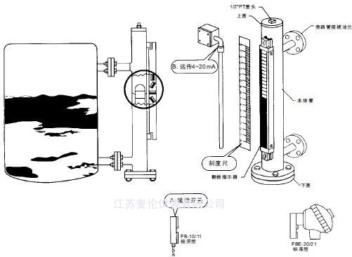 伴熱溫度根據介質情況確定;磁翻板液位計安裝必須垂直,磁翻板液位計與容器引管間應裝有球閥,便于檢修和清洗;介質內不應含有固體雜質或磁性物質,以免對浮子造成卡阻;使用前應先用校正磁鋼將零位以下的小球置成紅色,其它球置成白色;打開底法蘭,裝入磁性浮子(注意:重端帶磁性一端向上,不能倒裝。);調試時應先打開上部引管閥門,然后緩慢開啟下部閥門,讓介質平穩進入主導管(運行中應避免介質急速沖擊浮子,引起浮子劇列波動,影響顯示準確性),觀察磁性紅白球翻轉是否正常,然后關閉下引管閥門,打開排污閥,讓主導管內液位下降。