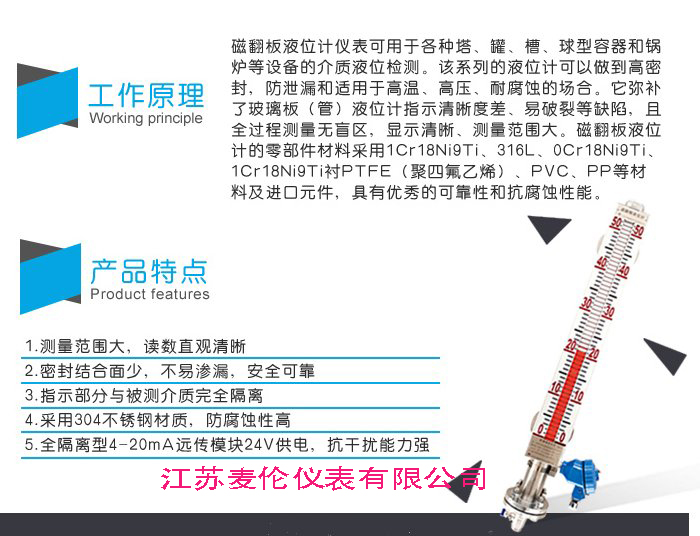 用途:磁性翻板液位計由本體、翻板盒(由紅白磁性小翻板組成)、浮子、法蘭蓋等組成,用于各種液體容器的液位測量。磁翻板液位計可用于高溫、防爆、防腐、食品飲料等場合進行就地顯示或遠程顯示控制液位。磁翻板液位計能在高溫、高壓、高粘度和強腐蝕條件下實現高密封、高防泄漏和液位測量。