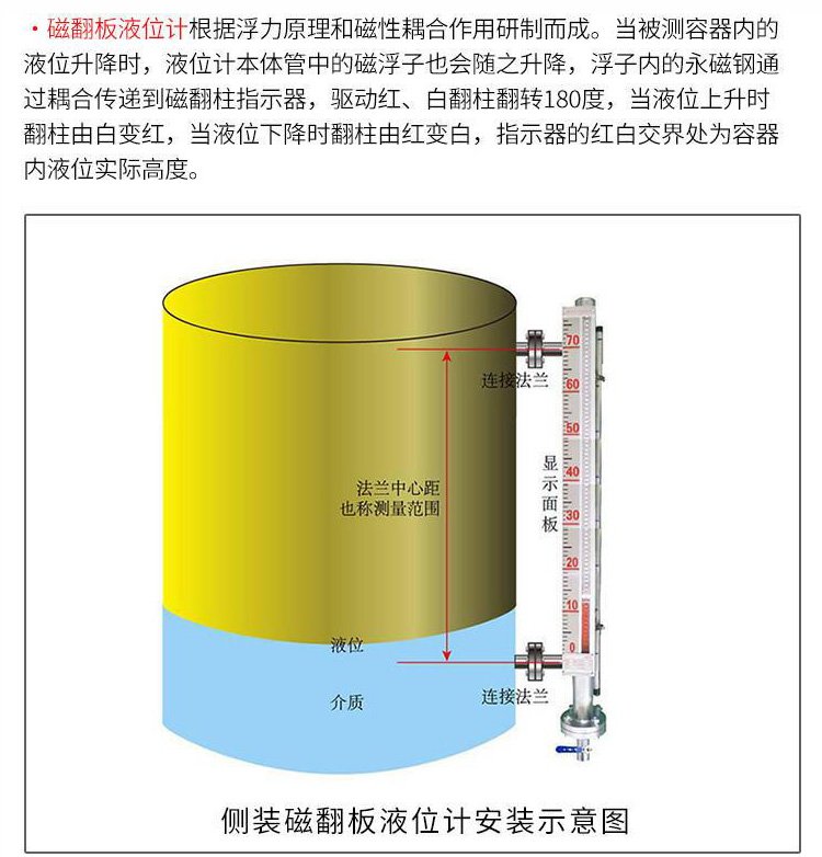 磁翻板液位計的基本知識;磁翻板液位計又稱磁翻板液位計、磁翻板柱液位計和磁浮子液位計。它基于磁耦合原理工作,彌補了玻璃管液位計在高溫高壓下不能工作且易碎的諸多缺點;磁翻板液位計有兩種安裝方式:側裝和頂裝。無論采用哪種方式,都可以捆綁遠程傳輸裝置,以便液位計可以在本地顯示液位,并遠程監控液位。