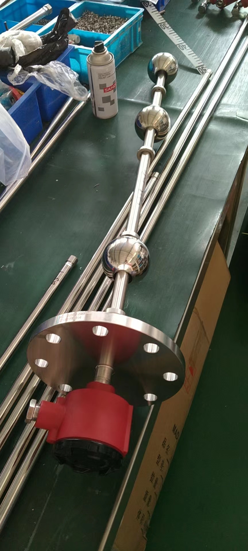 浮球液位計(jì)通過(guò)連接法蘭安裝在容器頂部。浮球根據(jù)排出液體體積相等的原則浮在液位上。當(dāng)容器的液位發(fā)生變化時(shí),浮球也會(huì)上下移動(dòng)。由于磁效應(yīng),浮球液位計(jì)的干彈簧被磁力吸引,將液位位置轉(zhuǎn)換為電信號(hào),并通過(guò)顯示儀表