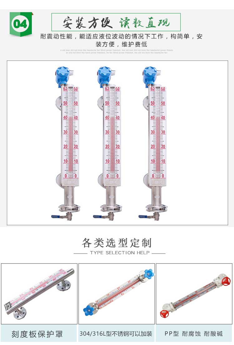 磁翻板液位計(jì)的結(jié)構(gòu)。磁翻板液位計(jì)的結(jié)構(gòu)關(guān)鍵在于:1個(gè)指示器,2個(gè)磁懸浮,3個(gè)浮桶,IV連接法蘭,IV過(guò)濾閥。磁翻板液位計(jì)指示器,又稱顯示信息控制面板,是液位儀現(xiàn)場(chǎng)顯示信息和檢測(cè)的關(guān)鍵。磁懸浮列車與浮桶中的待測(cè)液體直接接觸,并在待測(cè)容器中用液位計(jì)提升器提升。防腐型磁翻板液位計(jì)的磁懸浮也需要外襯PTFE。