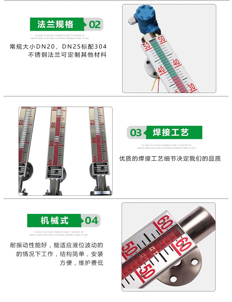 整個(gè)過程無盲區(qū),顯示醒目,讀數(shù)直觀,測量范圍大。現(xiàn)場指令部分不與液體介質(zhì)直接接觸,因此對于高溫、高壓、高粘度、有毒、有害、強(qiáng)腐蝕性介質(zhì)更有優(yōu)勢。因此,它比傳統(tǒng)的玻璃管、板式液位計(jì)具有更高的可靠性、安全性、性、實(shí)用性。側(cè)裝式磁柱液位計(jì)*大的特點(diǎn)是液體介質(zhì)與指示器完全隔離,因此在任何情況下都非常安全、可靠、耐用。且,各類液位計(jì)均配有液位報(bào)警和控制開關(guān),可實(shí)現(xiàn)液位或接口的上下報(bào)警、控制或聯(lián)鎖。該系列側(cè)裝式磁柱液位計(jì)適用于電力、石油、化工、冶金、生態(tài)環(huán)境保護(hù)、船舶、建筑、食品等行業(yè)生產(chǎn)過程中的液位測量和控制。