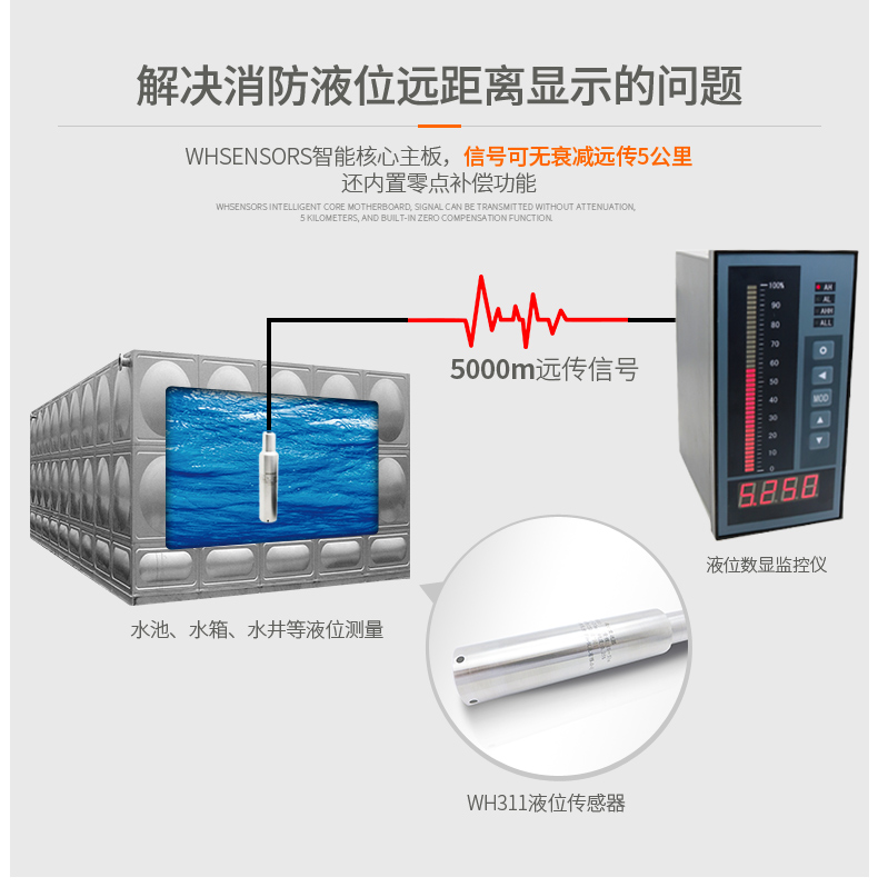 江蘇麥倫儀表有限公司專門針對上述要求開發出一款液位實時監測系統,其中Wspan11水位探頭直接投入安裝到消防水池或者水箱的底部,WH6液位專用顯示器安裝在消防控制中心就可以實時監測消防水箱水池的實時水位,并帶有高低液位報警功能,確保消防水箱在滿水位運行。