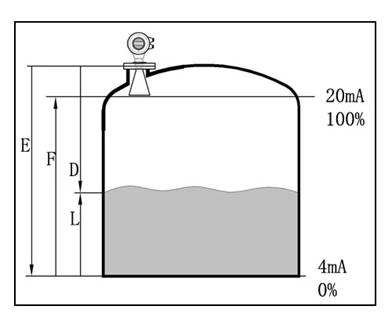 通過輸入空罐高度E(=零點),滿罐高度F(=滿量程)及一些應用參數來設定,應用參數將自動使儀表適應測量環境。對應于4-20mA輸出。