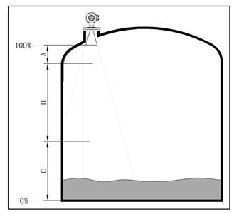 1測量范圍從波束觸及罐低的那一點開始計算,但在特殊情況下,若罐低為凹型或錐形,當物位低于此點時無法進行測量。