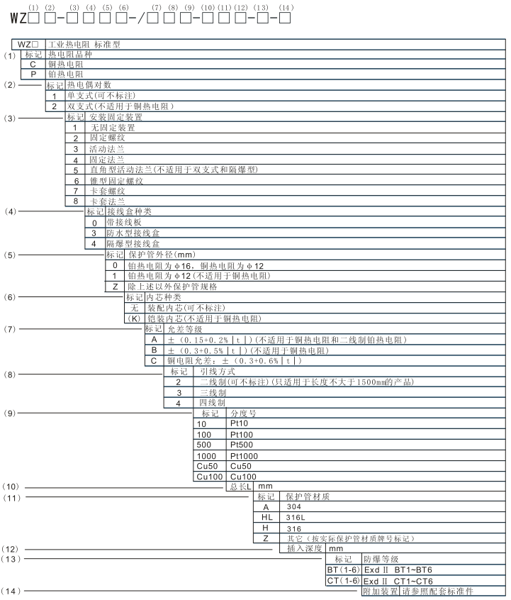 隔爆型熱電阻通過特殊結構的接線盒,把其外殼內部爆炸性混合氣體因受到火花或電弧等影響而發生的爆炸局限在接線盒內,生產現場不會引超爆炸。隔爆型熱電阻可用于Bla--B3c級區內具有爆炸危險場所的溫度測量。