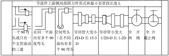 (2)節(jié)流件前后要求一段足夠長(zhǎng)的直管段,這段足夠長(zhǎng)的直管段和節(jié)流件前的局部 阻力件形式有關(guān)和直徑比B有關(guān),見表1 (B=d/D,d為孔板開孔直徑,D為管 道內(nèi)徑)。