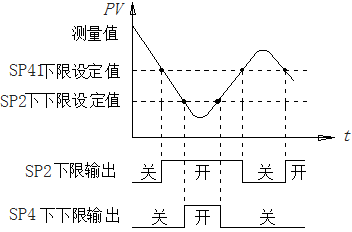 SP4設定位下下限報警,SP4=下下限設定值,P4h=0,P4c=30, SP2設定為下限報警,SP2=下限設定值,P2h=0,P2c=30,則SP4,SP2報警輸出。