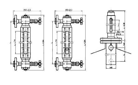 儀表的上下閥上裝有法蘭接頭,與容器連接構聯通器,透過玻璃管直接指示容器,液位,“夾套型”設有加熱或冷卻裝置。該裝置加熱時可用蒸氣,冷卻時可用循環水,這樣可以調節流動性能,夾套型接管尺寸ZG1/4內螺紋。