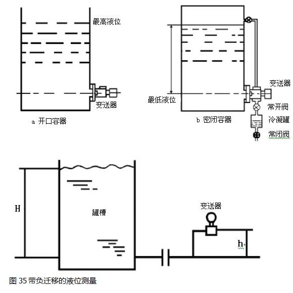 安裝在低液位的同一水平高度上。測量開口容器時,儀表負壓室通大氣。測量密封容器時負壓室通容器上部,此時若負壓室保持干燥,則可不裝冷凝罐,若安裝冷凝罐應定期將罐中的冷凝液排出;排液時應將常開閥關閉,以免變送器承受單向壓力,見圖34。