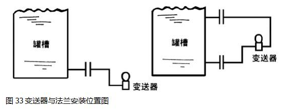 b)一個遠傳法蘭的變送器安裝時應使變送器低于法蘭及流程接頭或保持同一水平,帶兩個遠傳法蘭并安裝在不同高度的變送器,如測量一槽罐的液位,應安裝在兩法蘭/流程接頭之間的中點或中點以下。變送器與法蘭的安裝位置見圖33。