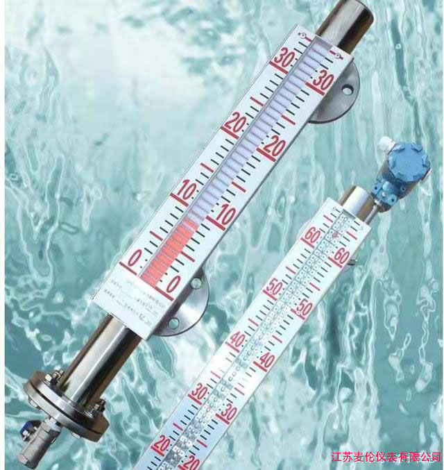 其磁翻板液位計是以浮磁鐵感應雙色薄片的翻轉,來指示液位的一種新型儀表。導管內磁浮鐵隨液位的升降而上下運動,同時感應到外側指示器內的雙色薄片翻轉,有液位時轉示紅色、無液位時轉為白色。紅色和白色色帶的界線即代表液位高度。在指示器左側配有醒目的刻度尺,從而使液位的就地指示顯得更加清晰。