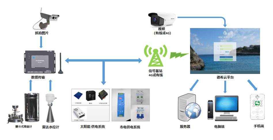 自動監測站建設主要監測庫區雨量和庫水位,根據水庫規模設立數量不等的監測點,監測設備采用雷達水位計、翻斗式雨量計、串口攝像頭、視頻攝像頭等設備,采用無線GPRS通信模式,設備供電可根據需要采用太陽能蓄電池供電系統或者市電供電系統。