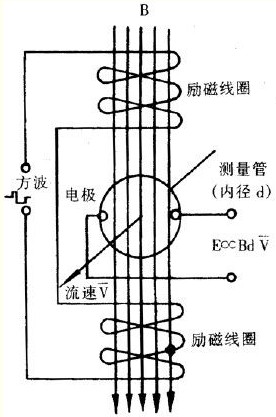 勵磁線圈 向方波脈沖勵磁時,將在與測量管軸線垂直的方向上產生一磁通量密度為 B 的工作磁場。此時,如果具有一定電導率的流體流經測量管,將切割磁力線感應 出電動勢 E。電動勢 E 正比于磁通量密度 B、測量管內徑 d 與平均流速 V 的乘積,電動勢 E(流量信號)由電極檢出并通過電纜送至轉換器。轉換器將流量信號放大處理后,可顯示流量、總量,并能輸出脈沖、模擬電流等信號,用于流量的控制或調節。