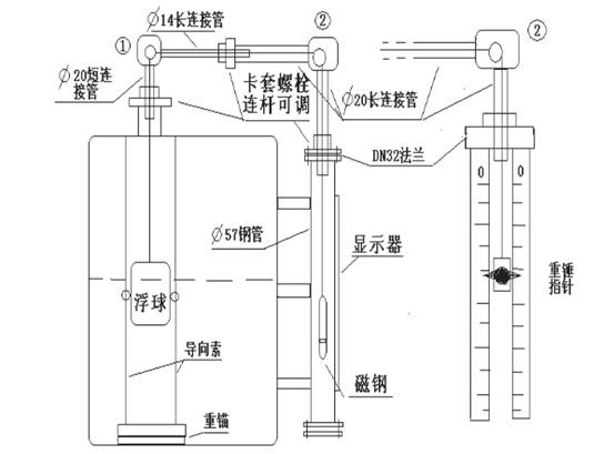 液位計是根據力平衡原理設計的,當罐內液位處于某--位置時浮標重量W,重錘指針重量W1和浮標浸在液體中所受浮力F,整個系統中摩擦力f,四力處于平衡狀態(即W-F-W1-f=0)。當液位上升時,由于牽引索吊著浮子沿導向索被浮起,液體浮力,F增大,使原平衡系統地四力失去平衡,在重力的作用下,重錘指針(8)向下滑行,同時也連續地在標尺.上指示液位的上升高度。同理,可說明液位下降時,浮子浮力F減少,使牽引索與液體同步下降,由于浮子的重量大于重錘指針的重量,使指針向上運動,同樣在液位連續下降變化時,重錘指針能隨之連續地指示液位的下降情況,從而達到準確測量液位變化的目的。
