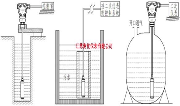在開口的容器中測量靜止流體液位時,把投入式液位變送器垂直投入到容器的底部,在容器的開口處將連接變送器的電纜線和接線盒固定。當介質粘稠度較大是(如污水池)可以加裝套管或者支架,保證變送器可以投入帶容器的底部。露天安裝時,應盡量把變送器接線盒置于通風干燥處,避免強光直接照射和雨淋,造成殼體溫度過高或進水,從而損壞變送器內部電路板。