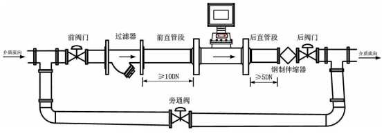 流量計表體應盡量保持水平安裝,不推薦垂直安裝,以防止換能器安裝孔的空腔積水,影響超聲波的傳輸(若氣質干燥則無影響),降低測量準確度。在氣體介質較臟的場合,可在流量計的上游以不影響被測氣體流場的位置安裝效果良好的氣體過濾器。嚴禁帶流量計焊接管道法蘭,建議做短節輔助焊接管道法蘭,以保證表個體整體受力情況。安裝流量計前要將管道內部清理干凈。為了便于維修維護,不影響正常的使用,建議設置旁通。流量計安裝在室外使用時,建議加配防護罩,以免雨水浸入和烈日曝曬而影響流量計使用壽命。流量計需可靠接地,但不得與強電系統地線共用。