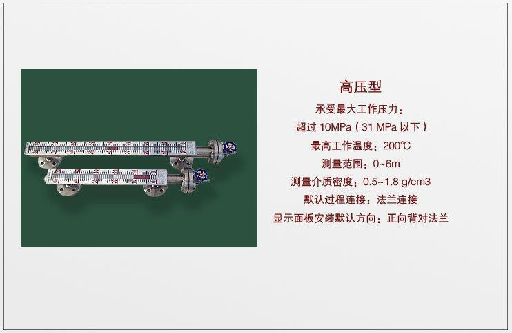 磁翻板液位計指示器安裝在桶槽外側或上面,用以指示和控制桶槽內的封形式可根據需要加裝排污閥。接續法蘭可接受定制液位高度的一種控制儀表,指示器由磁性色片組成,當本體管內的磁性浮球隨液位上升時色片翻轉,即可顯示液位高度,也可在本體管上加裝磁性開關或遠傳變送器,輸出開關信號或模擬量信號。適合用于高溫、高壓、耐腐蝕等場合,可就地顯示和遠程控制。本體管采用無縫鋼管,連接管處采用拉孔焊接,內部無劃痕。安裝方式可選擇側裝和頂裝,本體下端密封。